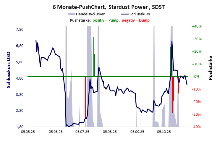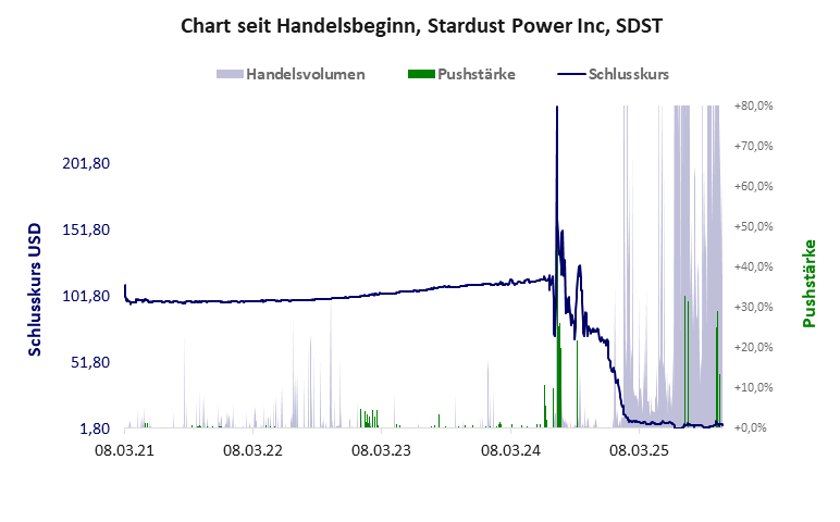 Stardust Power hat ein mäßiges Gesamtscoring und ist eine billige Aktie mit praktisch einem Totalverlust. Das Gesamtvermögen ist überschaubar, die Vermögenswerte scheinen werthaltig zu sein, der Umsatz ist nicht existent, die Ertragslage extrem verlustreich, der Vermögensverlust extrem hoch.