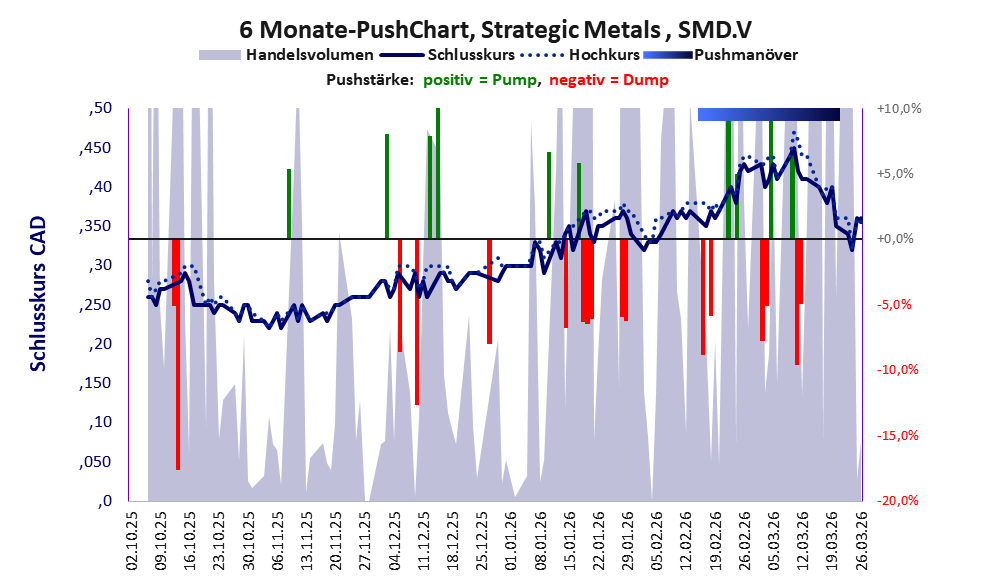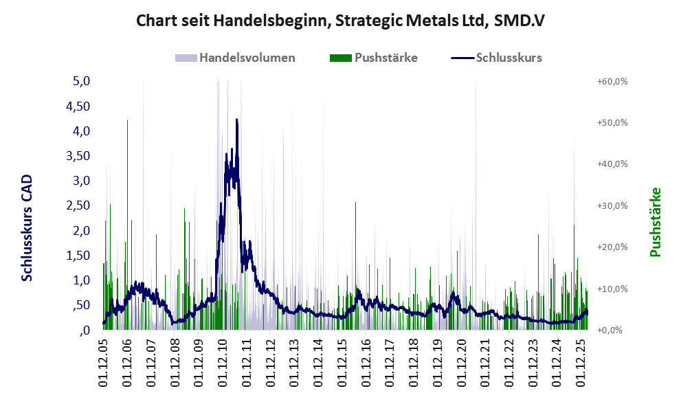 Über diese Aktie berichtet w:o. Das tägliche Handelsvolumen betrug an obiger Börse während der letzten drei Monate bis Berichtsdatum: 100.380 Stück, das sind 0,1% der ausgegebenen Aktien. Bei Strategic Metals fehlt ein operatives Geschäft, stattdessen wird das Geld der Investoren verbrannt.