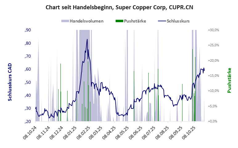 Super Copper hat ein unbefriedigendes Gesamtscoring und ist ein Pennystock mit Kursgewinn. Das Gesamtvermögen ist karg, die Vermögenswerte scheinen nicht vorhanden zu sein, der Umsatz ist nicht existent, die Ertragslage extrem verlustreich, die Geldverbrennung extrem hoch.
