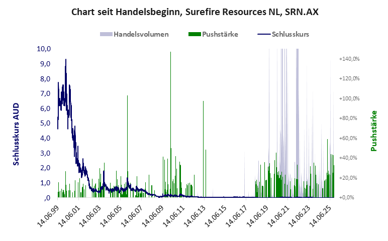 eine völlig wertlose Firma mit einer Aktie, deren Kurs noch bei 0,001 Cent gepusht wird. Surefire Resources hat ein kritisches Gesamtscoring und ist ein mickriger Pennystock mit praktisch einem Totalverlust. Das Gesamtvermögen ist überschaubar, die Vermögenswerte scheinen nicht werthaltig zu sein, der Umsatz ist nicht existent, die Ertragslage extrem verlustreich, die Geldverbrennung extrem hoch.