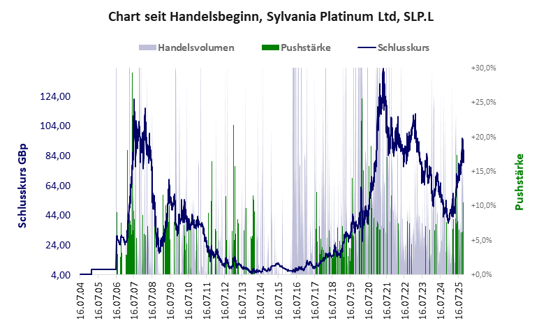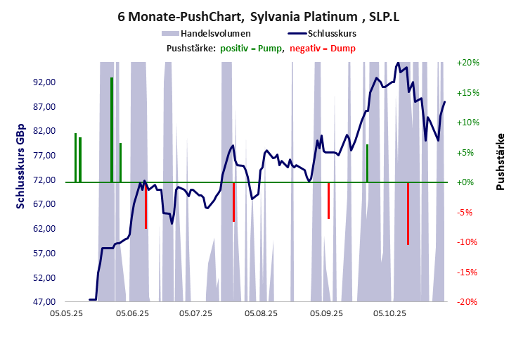 ein winziger, aber positiv arbeitender Betrieb, dessen Aktie klare Pushindikationen aufweist. Pusher oder Medien? Sylvania Platinum hat ein sehr gutes Gesamtscoring und ist ein Pennystock mit Kursgewinn. Das Gesamtvermögen ist groß, die Vermögenswerte scheinen werthaltig zu sein, der Umsatz ist sehr groß, die Ertragslage gut, der Vermögensverlust ziemlich hoch.