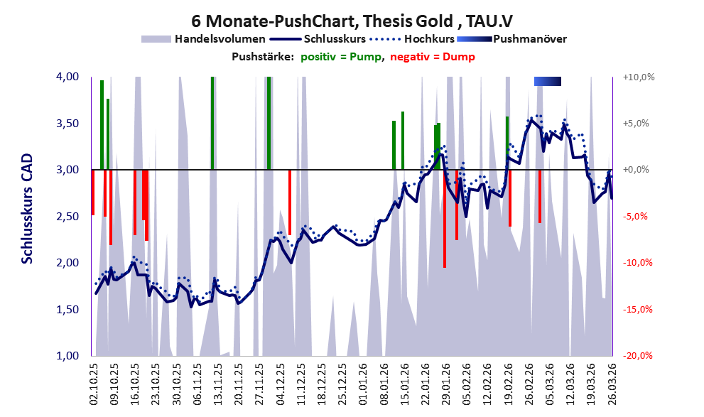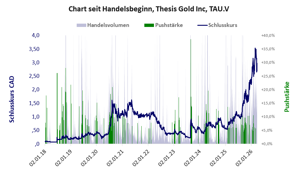 Über diese Aktie berichtet Streetwise. Das tägliche Handelsvolumen betrug an obiger Börse während der letzten drei Monate bis Berichtsdatum: 558.798 Stück, das sind 0,2% der ausgegebenen Aktien. Bei Thesis Gold fehlt ein operatives Geschäft, stattdessen wird das Geld der Investoren verbrannt.