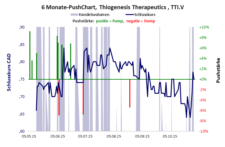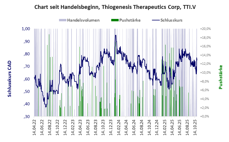 Thiogenesis Therapeutics hat ein mäßiges Gesamtscoring und ist ein Pennystock mit Kursgewinn. Das Gesamtvermögen ist karg, die Vermögenswerte scheinen nicht vorhanden zu sein, der Umsatz ist nicht existent, die Ertragslage extrem verlustreich, der Vermögensverlust extrem hoch.