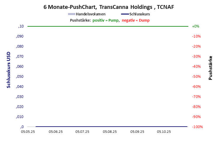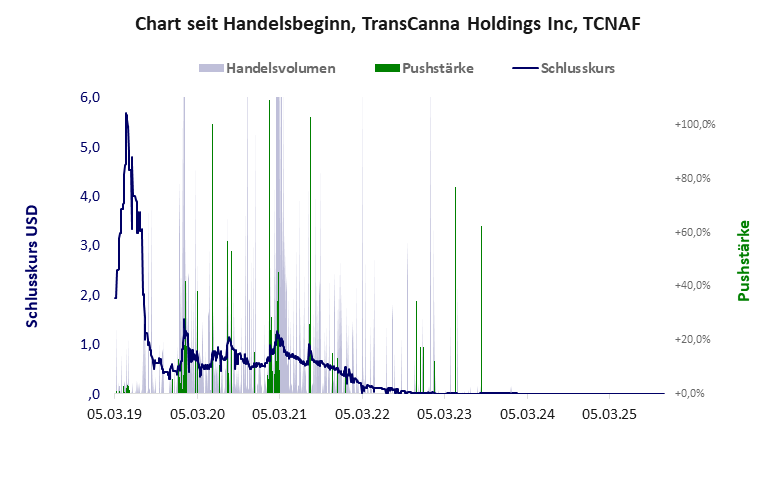 Es war 2019 das große Pushmanöver von James Pakulis. Er übernahm die Lifestyle Delivery Systems Inc und machte daraus die Transcanna Holdings und mit ihr einen Aktienpush von über 500%. Danach sorgten die Nachfolger für einige kleinere Pushes. Im Jahr 2024 war die Aktie wertlos und schied aus dem Handel. Sie ist an der kanadischen CSE "suspended". TransCanna Holdings hat ein unbefriedigendes Gesamtscoring und ist ein mickriger Pennystock mit praktisch einem Totalverlust. Das Gesamtvermögen ist überschaubar, die Vermögenswerte scheinen nicht werthaltig zu sein, der Umsatz ist überschaubar, die Ertragslage extrem verlustreich, die Geldverbrennung sehr hoch.