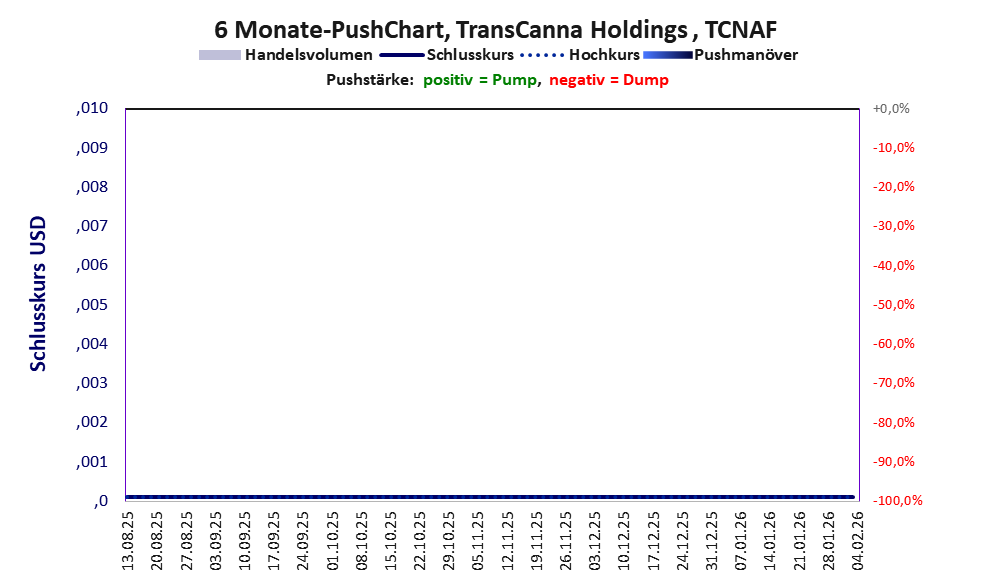 Es gibt seit 19.01.24 keinen Handel mehr. Es war 2019 das große Pushmanöver von James Pakulis. Er übernahm die Lifestyle Delivery Systems Inc und machte daraus die Transcanna Holdings und mit ihr einen Aktienpush von über 500%. Danach sorgten die Nachfolger für einige kleinere Pushes. Im Jahr 2024 war die Aktie wertlos und schied aus dem Handel. Sie ist an der kanadischen CSE „suspended“.