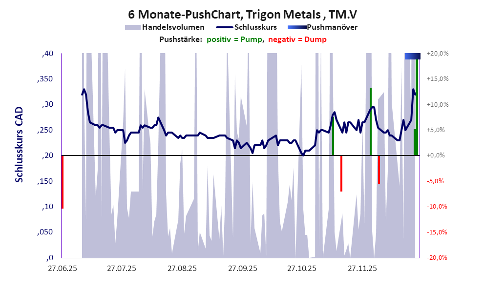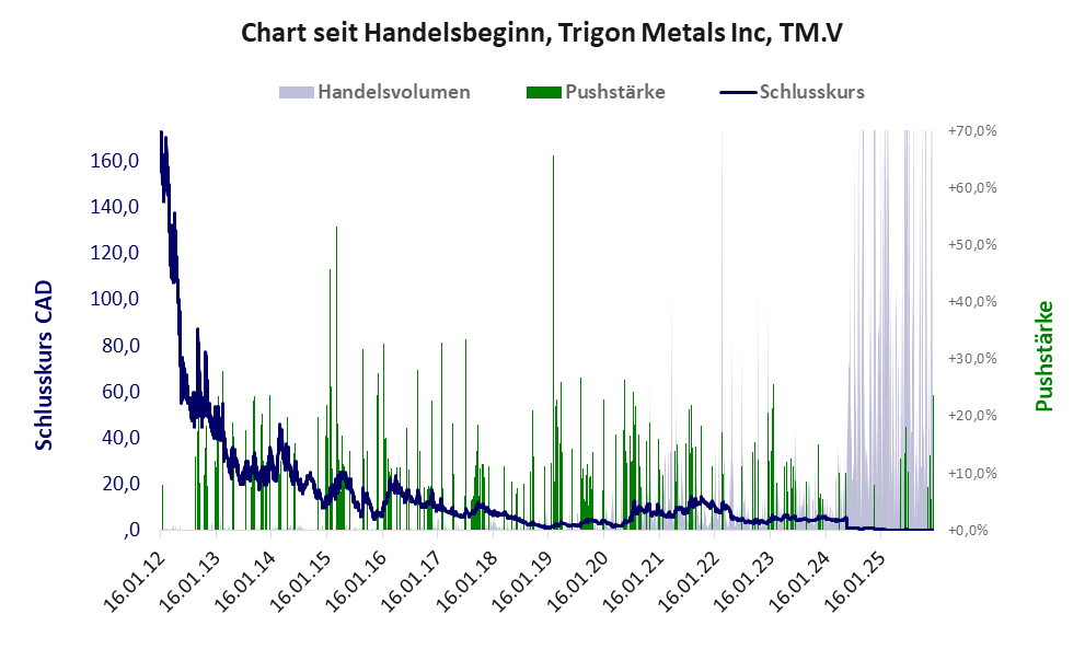 ein Miner mit ein paar aufgekauften, wertlosen Claims, der mit der Einbeziehung vom 03.12.2024 an der FWB ein Comeback versucht. Bei dieser Aktie liegt das „Inkassomodell“ vor, bei dem der Aktienkurs zu Beginn der Geschichte sein Allzeithoch hat. Die Akteure verkaufen schon zu Beginn nach und nach ihre billigst erworbenen Aktien, so dass der Kurs in verhältnismäßig kurzer Zeit abstürzt. Danach dümpelt der Aktienkurs in den meistn Fällen nahe null dahin und die Aktie dient nur noch kleineren, dennoch gewinnbringenden Pushmanövern und in vielen Fällen dem Algotrading. Dem ersten Einbruch nachfolgende größere Pushmanöver sind aber nicht ausgeschlossen.
