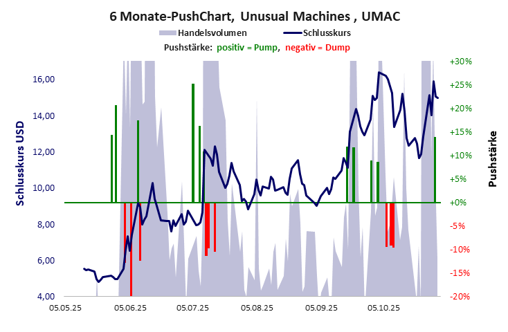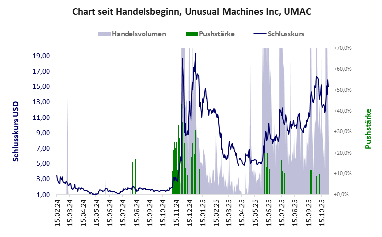 ein kleiner Mittelständler, der mit seinem Drohnen-Geschäft im Aufwind zu sein scheint. Gepusht wurde der Kurs wohl in erster Linie durch den Einstieg von Trump Junior und der Ansage, die Trump-Administration wäre für die Firma vorteilhaft. – Keine schlechten Aussichten, obwohl der Kurs die letzten Monate fiel. Unusual Machines hat ein sehr schlechtes Gesamtscoring und ist eine günstige Aktie mit Kursgewinn. Das Gesamtvermögen ist überschaubar, die Vermögenswerte scheinen nicht werthaltig zu sein, der Umsatz ist überschaubar, die Ertragslage extrem verlustreich, die Geldverbrennung sehr hoch.