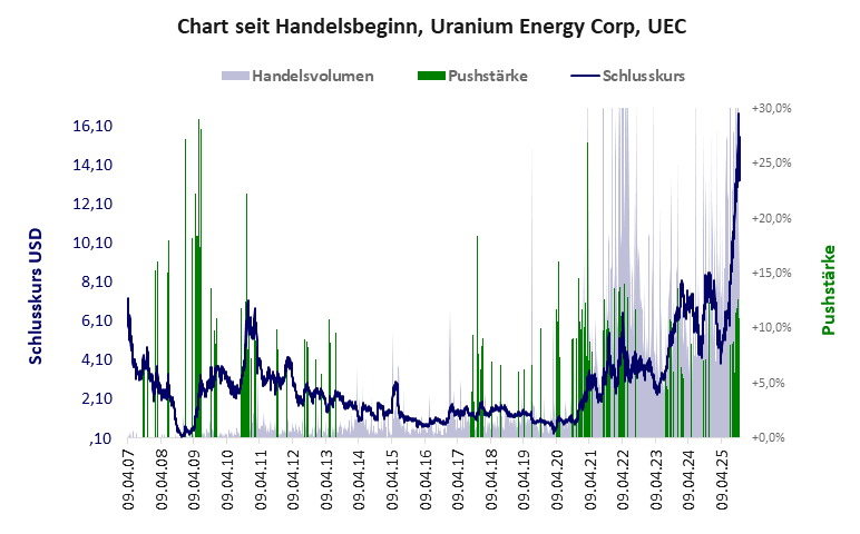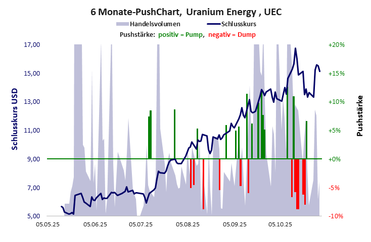 Trotz gepushter Kurse ist dies keine Pusheraktie, denn das Unternehmen verfügt über ausgedehnte Ressourcen und beginnt mit dem Uranverkauf aus eigener Produktion. Uranium Energy hat ein akzeptables Gesamtscoring und ist eine günstige Aktie mit Kursgewinn. Das Gesamtvermögen ist sehr groß, die Vermögenswerte scheinen sehr werthaltig zu sein, der Umsatz ist groß, die Ertragslage extrem verlustreich, die Geldverbrennung erträglich.