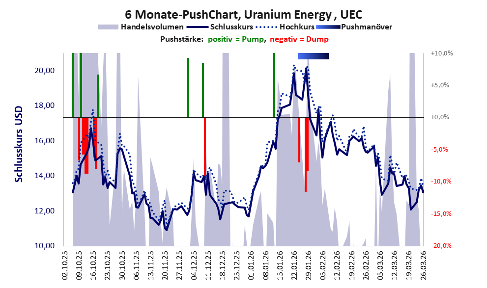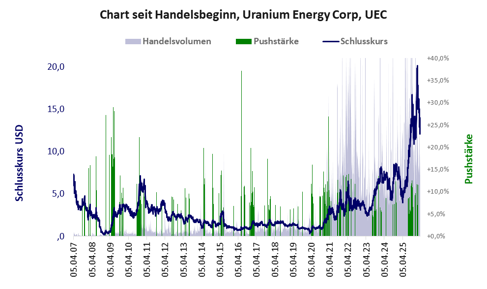 Über diese Aktie berichtet SRC. Das tägliche Handelsvolumen betrug an obiger Börse während der letzten drei Monate bis Berichtsdatum: 10.791.000 Stück, das sind 2,2% der ausgegebenen Aktien. Bei Uranium Energy wird bei schwachen operativen Geschäft zu viel Geld verbrannt.