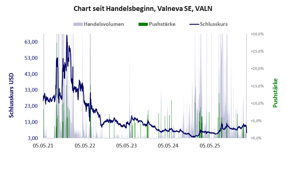 Über diese Aktie berichtet Apaton. Das tägliche Handelsvolumen betrug an obiger Börse während der letzten drei Monate bis Berichtsdatum: 46.370 Stück, das sind 0,1% der ausgegebenen Aktien. Die hohe Geldverbrennung in der Forschungsphase von Valneva SE hat sich gelohnt. Die Produktion wurde aufgenommen, ist aber noch unprofitabel.