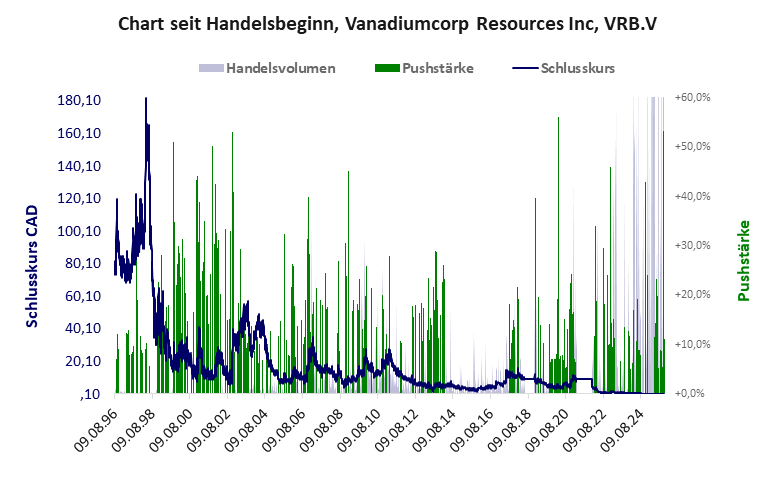Vanadiumcorp Resources hat ein schwaches Gesamtscoring und ist ein kleiner Pennystock mit praktisch einem Totalverlust. Das Gesamtvermögen ist überschaubar, die Vermögenswerte scheinen nicht werthaltig zu sein, der Umsatz ist nicht existent, die Ertragslage extrem verlustreich, die Geldverbrennung extrem hoch.