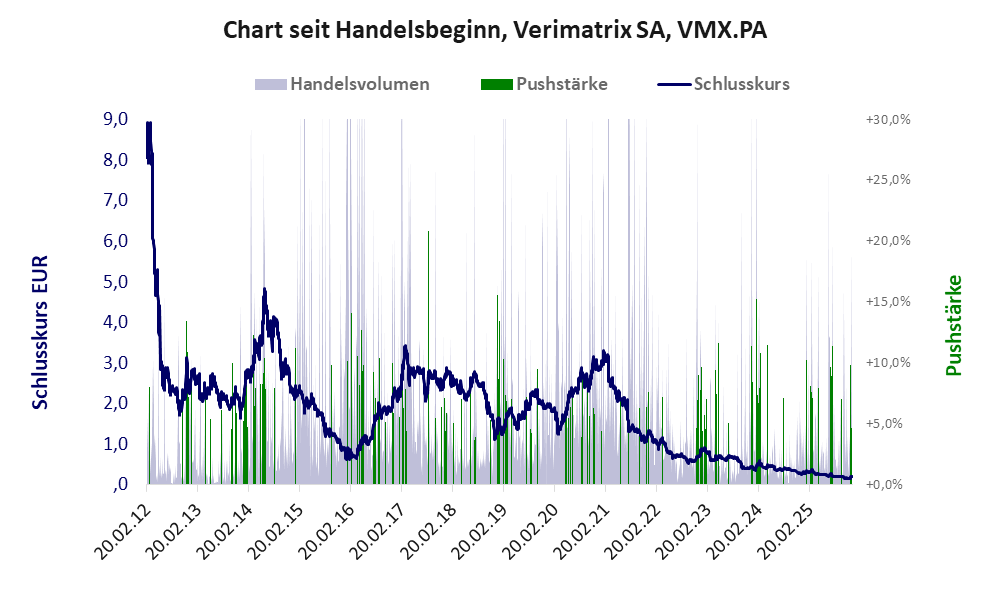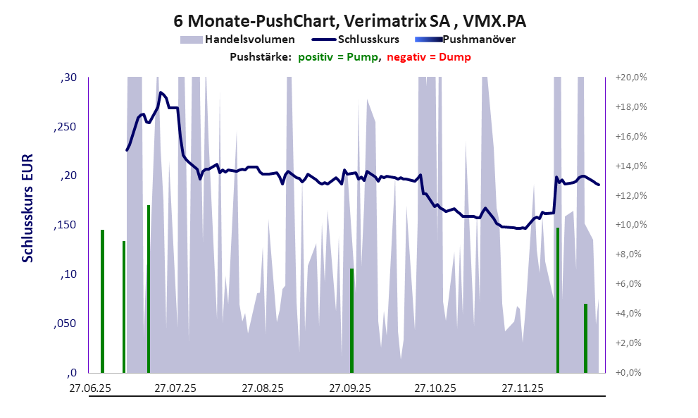 Bei dieser Aktie liegt das „Inkassomodell“ vor, bei dem der Aktienkurs zu Beginn der Geschichte sein Allzeithoch hat. Die Akteure verkaufen schon zu Beginn nach und nach ihre billigst erworbenen Aktien, so dass der Kurs in verhältnismäßig kurzer Zeit abstürzt. Danach dümpelt der Aktienkurs in den meistn Fällen nahe null dahin und die Aktie dient nur noch kleineren, dennoch gewinnbringenden Pushmanövern und in vielen Fällen dem Algotrading. Dem ersten Einbruch nachfolgende größere Pushmanöver sind aber nicht ausgeschlossen.