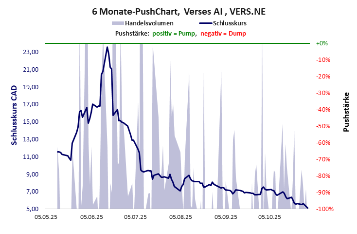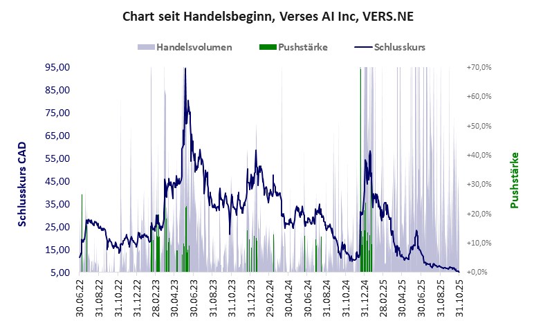 ein stark defizitäres, kleines Unternehmen mit gepushtem Kurs. Hinter den Gründern und Vätern der AI-Platform namens GENIUS steht die Spectre Capital Corp von Geoffrey Balderson, dessen Name allzu häufig im Netzwerk auftaucht. Die Frage, handelt es sich um einen gigantischen Bluff oder um eine neue KI-Rakete ist nicht zu beantworten. Und somit kann man die Grafik " Verses AI hat ein unbefriedigendes Gesamtscoring und ist eine günstige Aktie mit einem starken Kursverlust. Das Gesamtvermögen ist überschaubar, die Vermögenswerte scheinen nicht werthaltig zu sein, der Umsatz ist überschaubar, die Ertragslage extrem verlustreich, die Geldverbrennung extrem hoch.