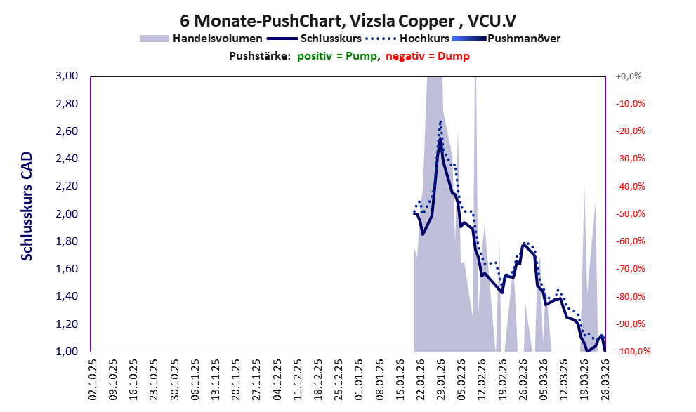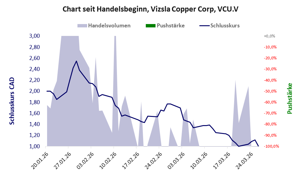 Das tägliche Handelsvolumen betrug an obiger Börse während der letzten drei Monate bis Berichtsdatum: 357.215 Stück, das sind 0,4% der ausgegebenen Aktien. Die Kurshistorie dieser Aktie an obiger Börse fehlt seit dem Start am 27.10.21 bis zum Relaunch am 20.01.26. Da Vizsla Copper kaum Vermögen besitzt und unprofitabel ist, hat der Aktienkurs keinen Wert. Die Aktie dient in erster Linie Pushmanövern.