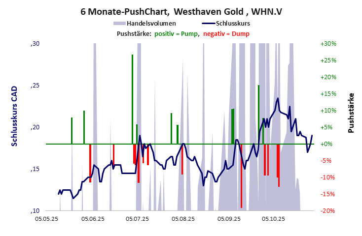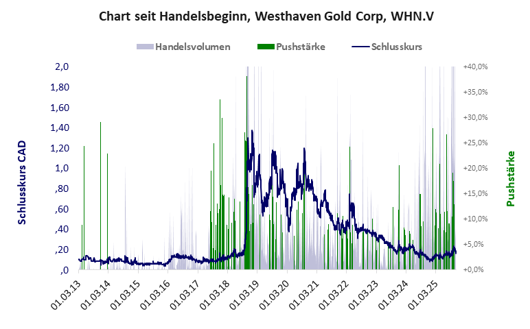 Westhaven Gold hat ein mäßiges Gesamtscoring und ist ein mickriger Pennystock mit Kursgewinn. Das Gesamtvermögen ist beträchtlich, die Vermögenswerte scheinen nicht werthaltig zu sein, der Umsatz ist nicht existent, die Ertragslage extrem verlustreich, die Geldverbrennung erträglich.