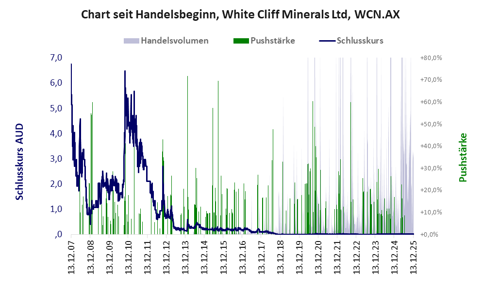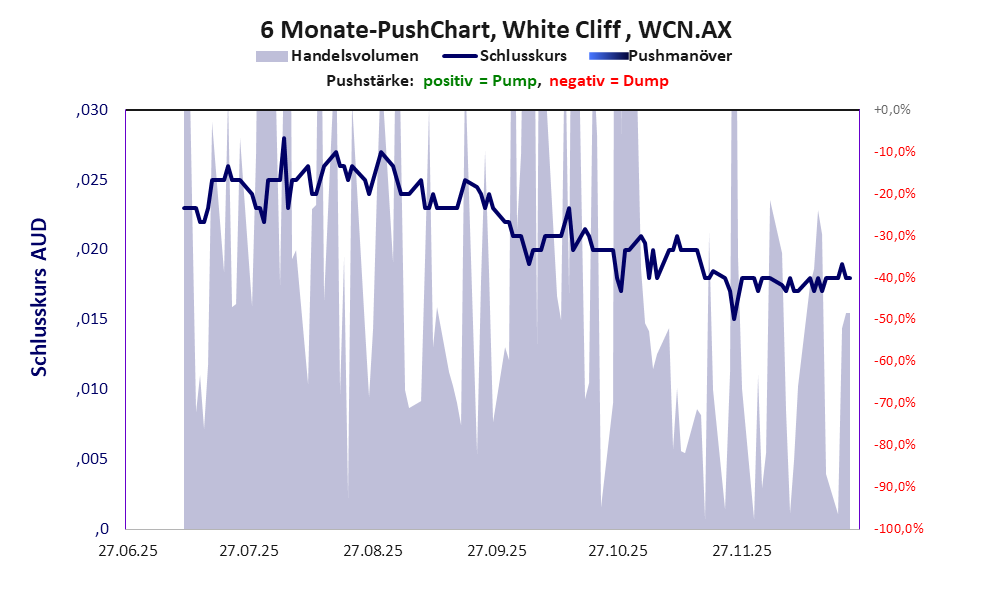 Bei dieser Aktie liegt das „Inkassomodell“ vor, bei dem der Aktienkurs zu Beginn der Geschichte sein Allzeithoch hat. Die Akteure verkaufen schon zu Beginn nach und nach ihre billigst erworbenen Aktien, so dass der Kurs in verhältnismäßig kurzer Zeit abstürzt. Danach dümpelt der Aktienkurs in den meistn Fällen nahe null dahin und die Aktie dient nur noch kleineren, dennoch gewinnbringenden Pushmanövern und in vielen Fällen dem Algotrading. Dem ersten Einbruch nachfolgende größere Pushmanöver sind aber nicht ausgeschlossen.