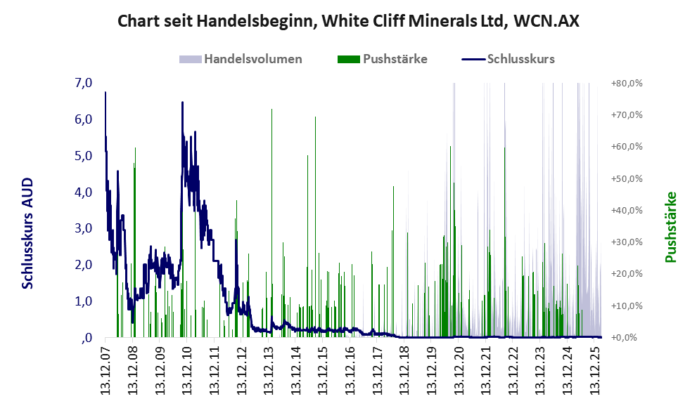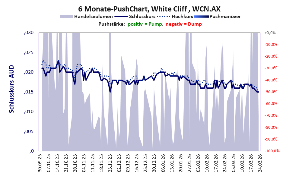 Bei dieser Aktie, über die w:o berichtet, liegt das Inkassomodell vor und es gibt 1 Pump & Dump-Manöver. Das tägliche Handelsvolumen betrug an obiger Börse während der letzten drei Monate bis Berichtsdatum: 5.714.987 Stück, das sind 0,2% der ausgegebenen Aktien. In Aktien der Klasse V darf man grundsätzlich nicht investieren. Es gibt keinen ordentlichen Geschäftsbetrieb. Die Aktie hat nur den Zweck, mit Pushmanövern oder Algotrading an der Börse Kasse zu machen.