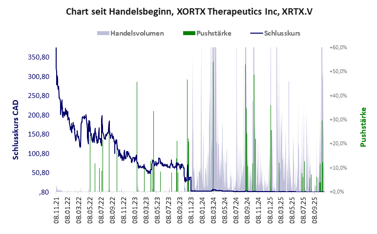 Es ist die Geschichte eines typischen Pharma-Start-Ups. Forscher gründen eine Pharmafirma auf Basis ihrer Erfindung und in der Erwartung, das Produkt in die Serienreife und erfolgreiche Vermarktung bringen zu können. Je belastbarer die Erwartungen sind, desto höher der Kurs bei Handelsstart. Können die Erwartungen nicht gehalten werden, verfällt der Kurs nach und nach. XORTX Therapeutics hat ein unbefriedigendes Gesamtscoring und ist ein Pennystock mit praktisch einem Totalverlust. Das Gesamtvermögen ist karg, die Vermögenswerte scheinen nicht vorhanden zu sein, der Umsatz ist nicht existent, die Ertragslage extrem verlustreich, die Geldverbrennung extrem hoch.