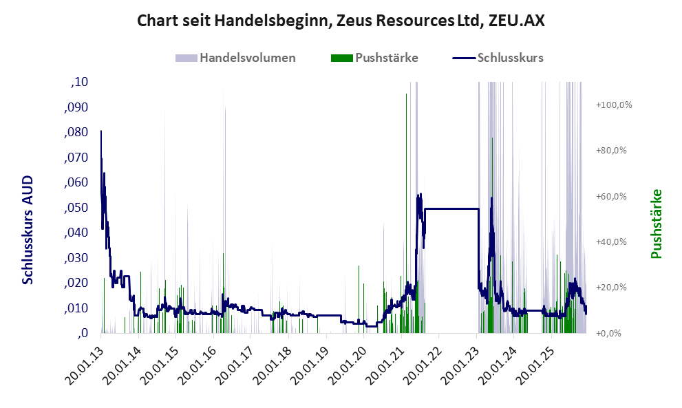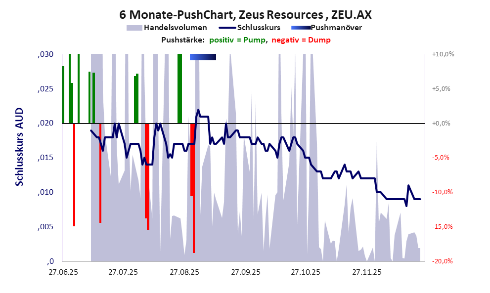 Bei dieser Aktie liegt das „Inkassomodell“ vor, bei dem der Aktienkurs zu Beginn der Geschichte sein Allzeithoch hat. Die Akteure verkaufen schon zu Beginn nach und nach ihre billigst erworbenen Aktien, so dass der Kurs in verhältnismäßig kurzer Zeit abstürzt. Danach dümpelt der Aktienkurs in den meistn Fällen nahe null dahin und die Aktie dient nur noch kleineren, dennoch gewinnbringenden Pushmanövern und in vielen Fällen dem Algotrading. Dem ersten Einbruch nachfolgende größere Pushmanöver sind aber nicht ausgeschlossen.