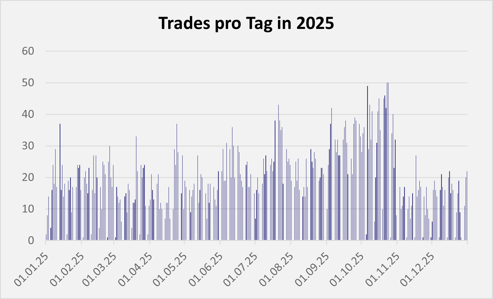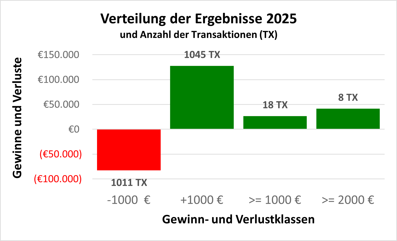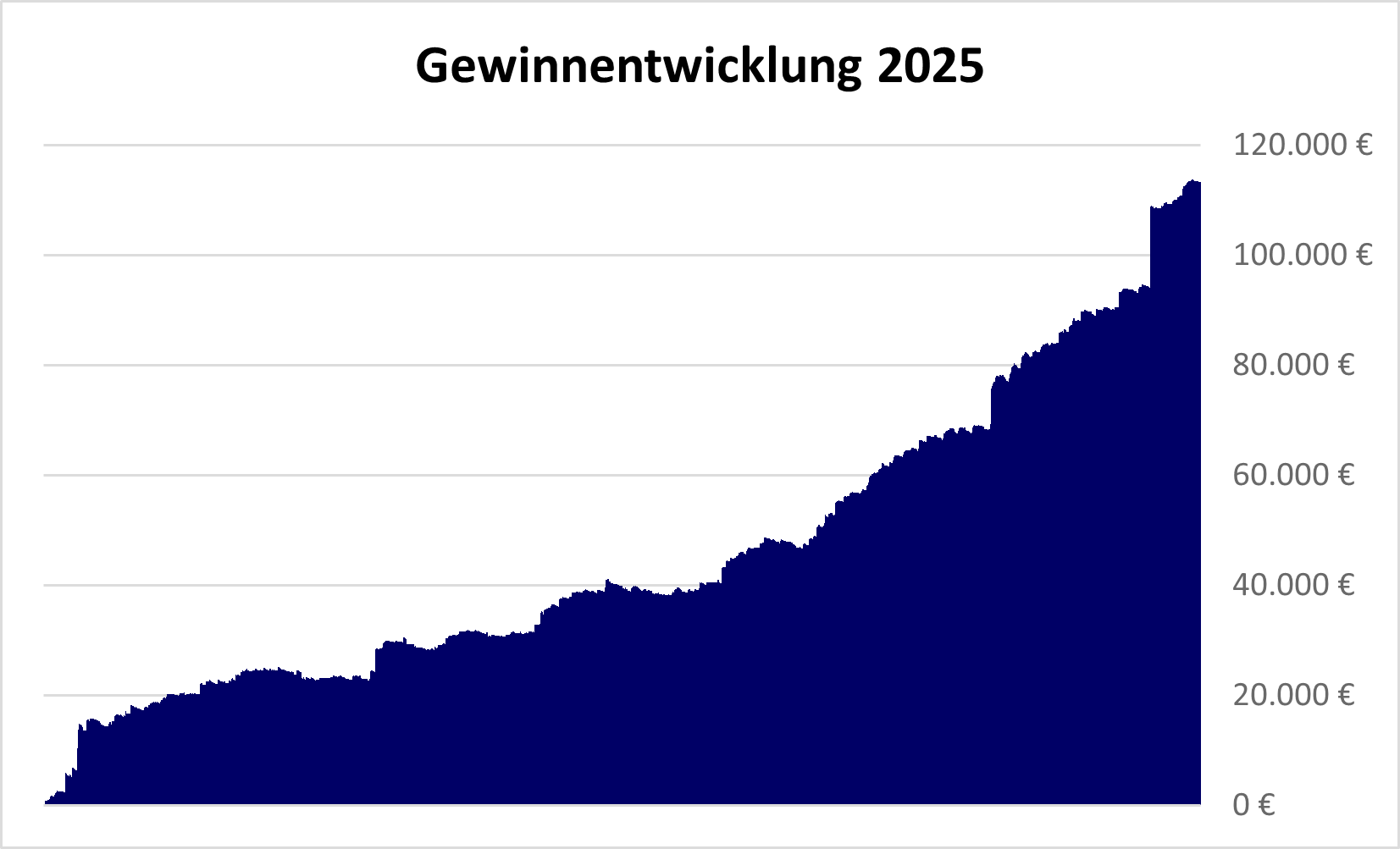 Der Computer führte im Jahr 2025 über 5.000 Transaktionen aus. Dies hätte in Realität zwar einen ziemlichen Zeitaufwand verursacht, aber der hohe Gewinn wäre der Lohn gewesen. Das Ergebnis aller Transaktionen, die auf den offiziellen Kursdaten von Yahoo beruhen und leicht überprüfbar sind, zeigen drei Grafiken.